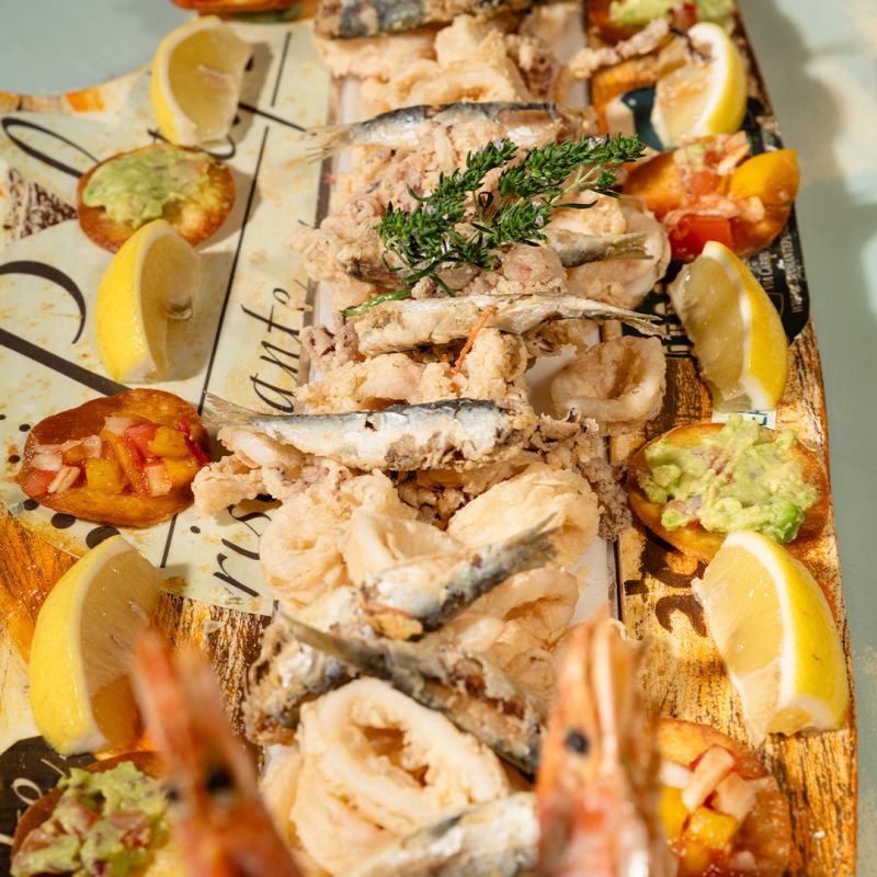 sfizioso fritto di pesce pezzato a metro con gamberoni, calamari, acciughe o sardine. servito con patatine alla paprika e salsa tartara.